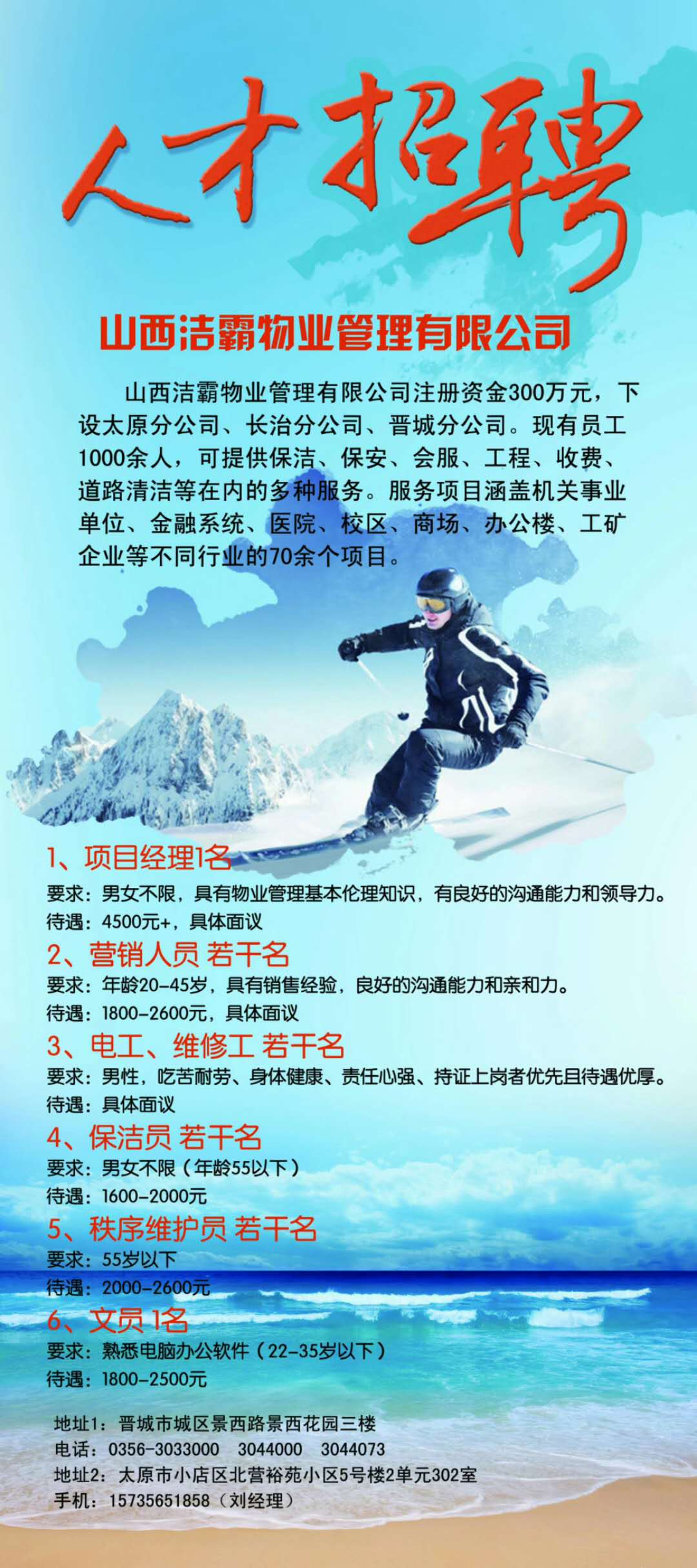 潔霸公司太原分公司現(xiàn)在正是招賢納才時(shí)候,希望各位有理想、有抱負(fù)的年輕人可以加入我們,共同為潔霸公司更加美好的明天而努力!