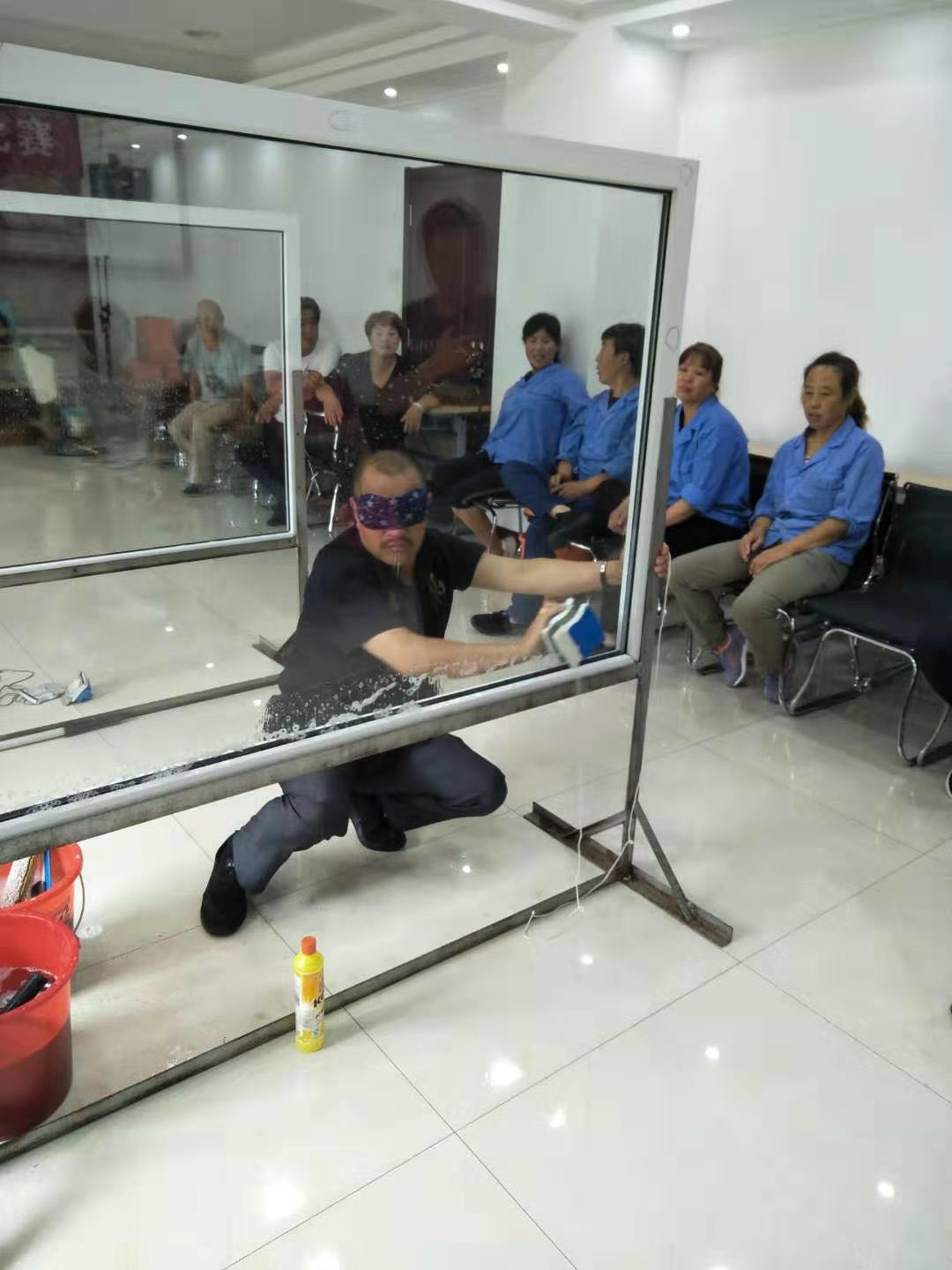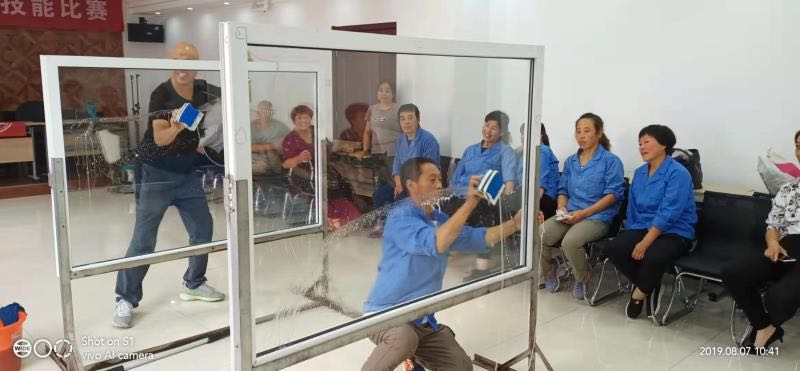 賽前,公司總經(jīng)理程晉軍、工會主席崔偉作了致辭動員。比賽選手個個摩拳擦掌,躍躍欲試。首先進行的是洗地機障礙演示技能比賽,比賽過程中每個選手都能嫻熟地安全避過比賽設置的障礙并能按正規(guī)操作章程進行,展示了過硬的操作技能;在高空外墻清洗安全防范實際演示過程中,穿工衣、帶安全帽、系安全繩以及放繩整個過程細致到位,一氣呵成;接著大家期盼的蒙眼擦玻璃賽將技能比賽推向了高潮,這是最富觀賞性的比賽,大家在佩服選手熟練的手法和技巧時,也對工程部對于服務質量和技術的高要求感到敬佩。比賽中洋溢著歡歌笑語,公司副總經(jīng)理張永智對比賽進行了實時精彩的點評。