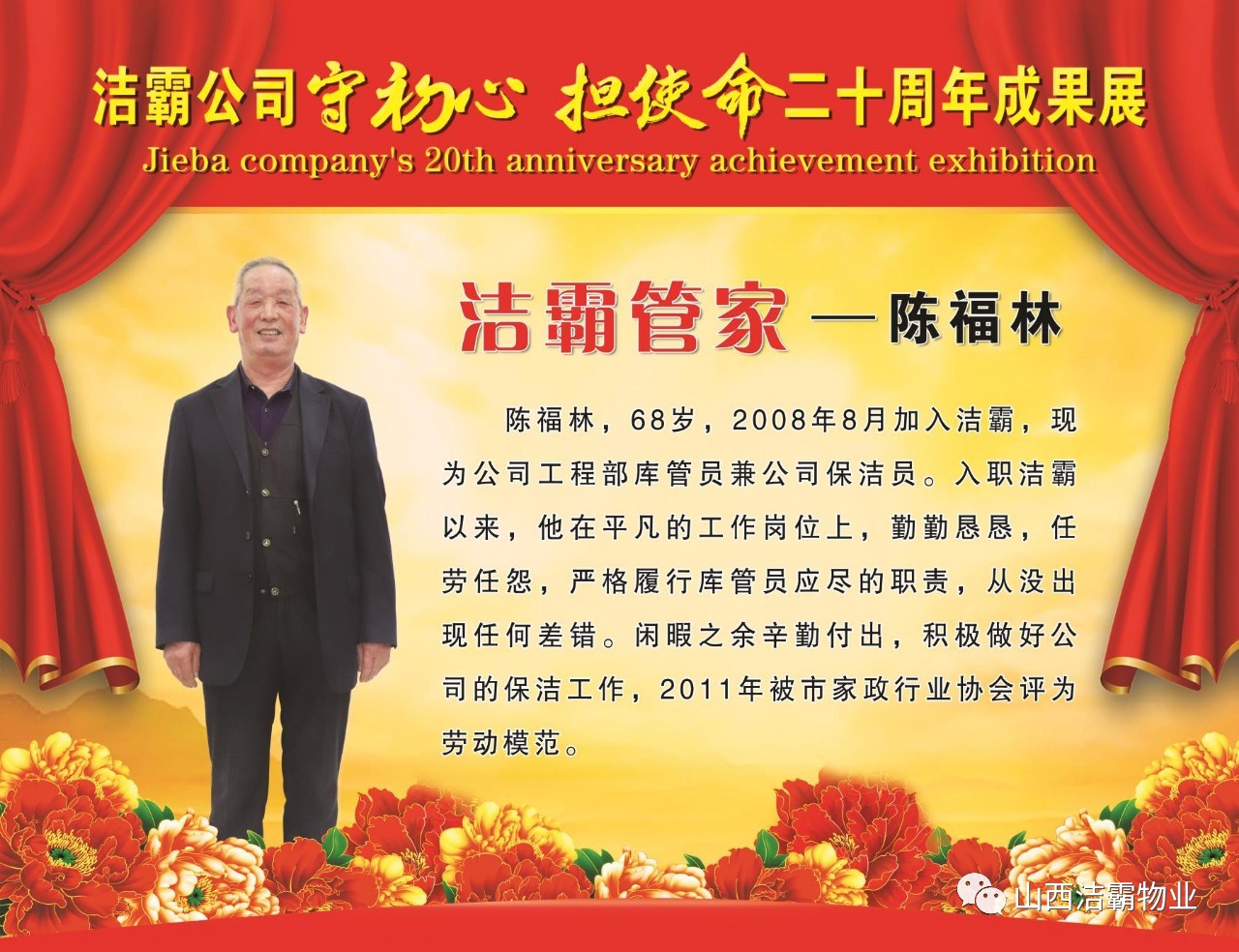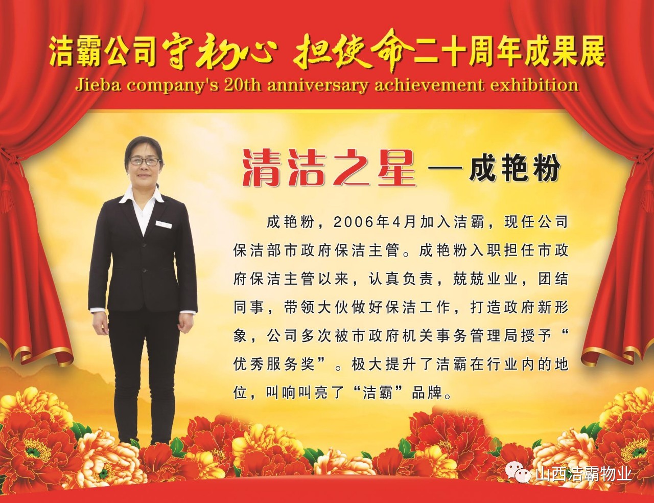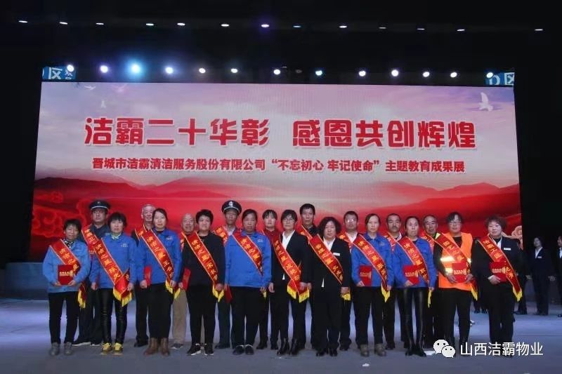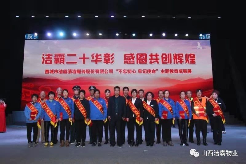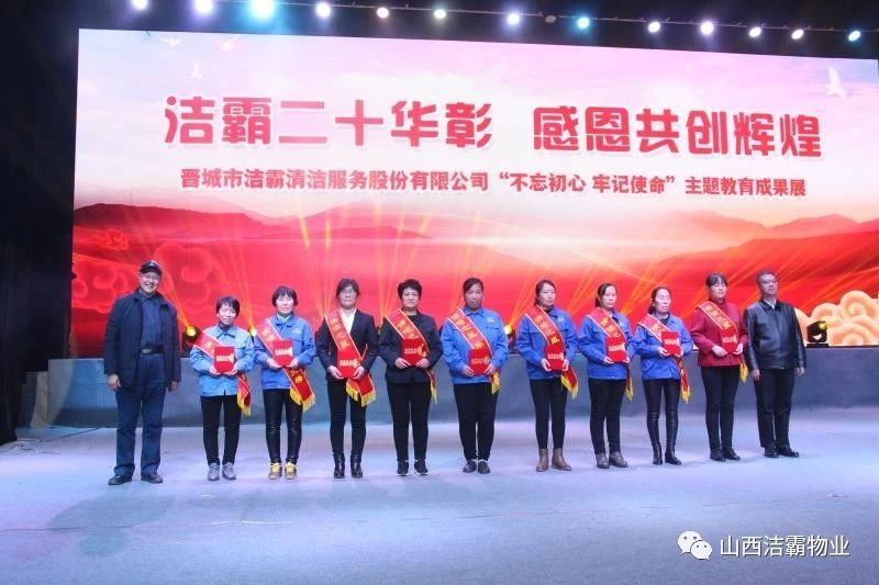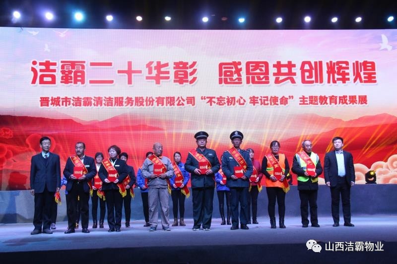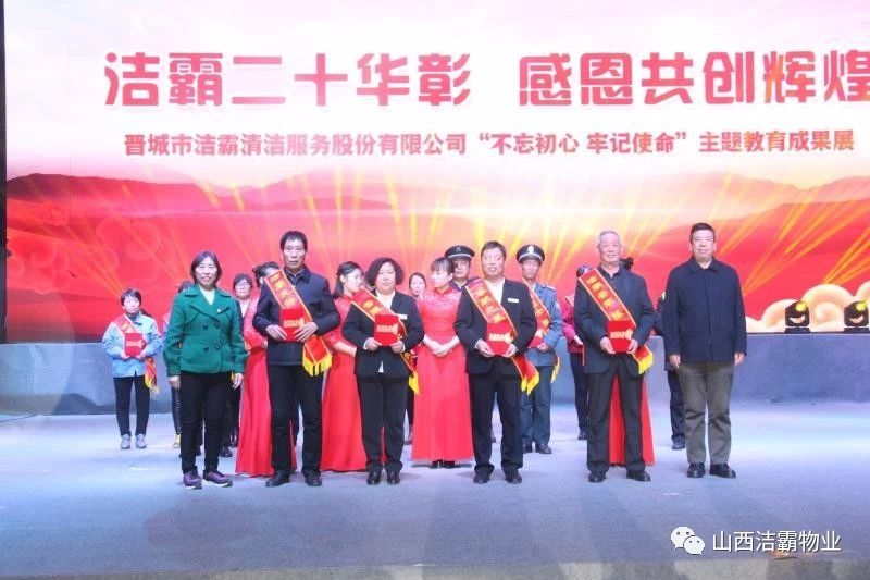 本次晚會(huì)以“潔霸二十華彰,感恩共創(chuàng)輝煌”為主題,此次慶典的核心思想是“感恩”,主要角色是潔霸的創(chuàng)業(yè)者。為此,公司對(duì)入職潔霸的創(chuàng)業(yè)功勛和一線員工進(jìn)行了表彰獎(jiǎng)勵(lì)。本次晚會(huì)共設(shè)8個(gè)獎(jiǎng)項(xiàng),包括“潔霸先鋒”“奉獻(xiàn)之星”“管理之星”“潔霸管家”“潔霸工匠”“清潔之星”“潔霸衛(wèi)士”“園藝之星”等。他們是:李山虎、張永智、史志霞、陳福林、王紅軍、余艷青、劉二丑、成艷粉、楊改梅、王書(shū)玲、張國(guó)榮、耿竹青、張粉霞、宋秋苗、陳先梅、張晉平、張偉山、趙瑞軍、王廣平、郭志云。晉城市原副市長(zhǎng)成育廷、晉城市商務(wù)局原局長(zhǎng)王新善、晉城市非公和社會(huì)組織工委書(shū)記郎軍芳、晉城市婦聯(lián)三級(jí)調(diào)研員李蓮菊、晉城市總工會(huì)商貿(mào)輕紡煙草服務(wù)業(yè)工會(huì)主席張玉濤、晉城市城區(qū)財(cái)政局局長(zhǎng)翟明太等領(lǐng)導(dǎo)為他們頒獎(jiǎng)。