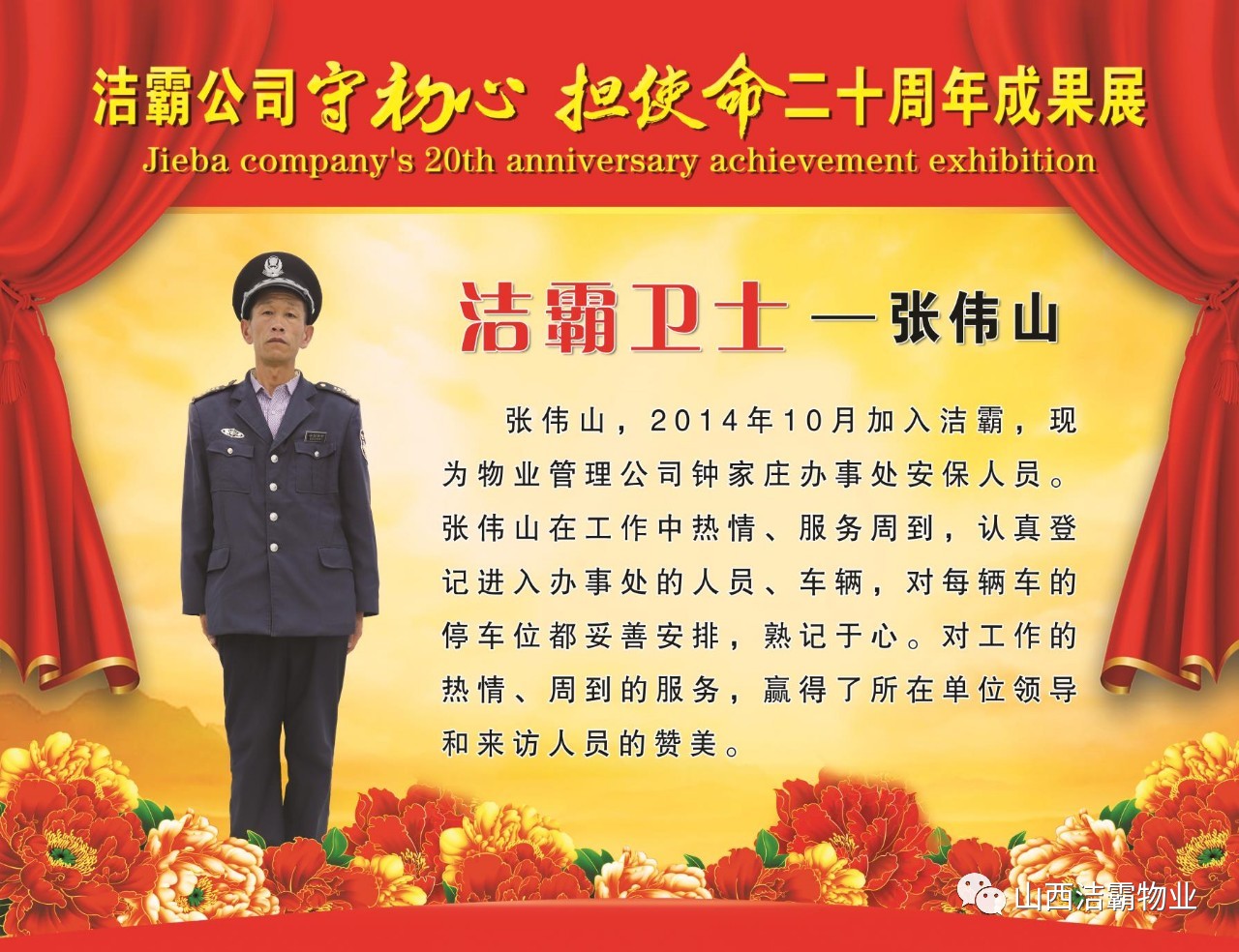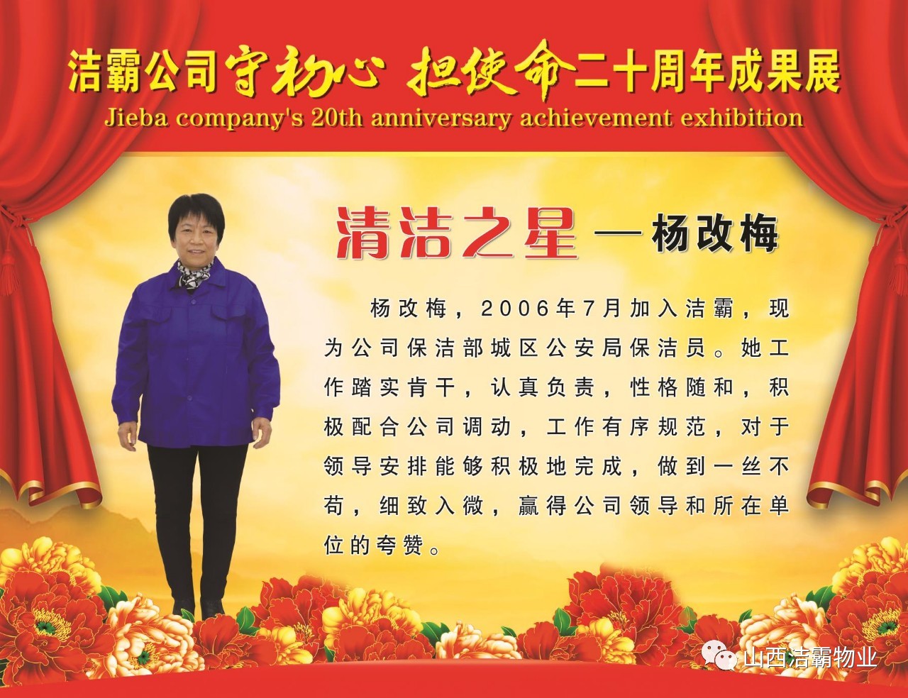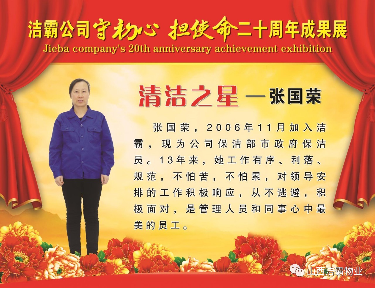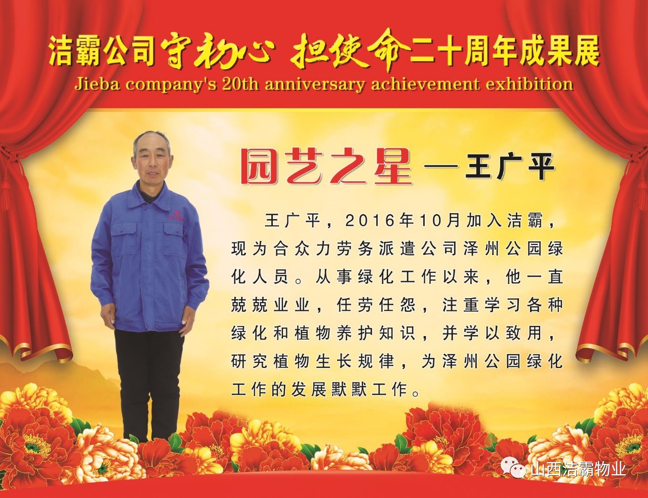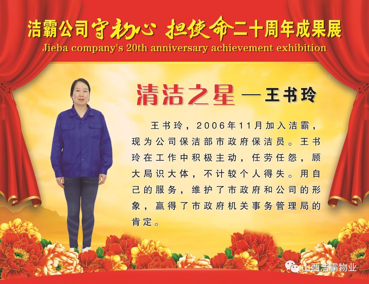 本次晚會(huì)以“潔霸二十華彰,感恩共創(chuàng)輝煌”為主題,此次慶典的核心思想是“感恩”,主要角色是潔霸的創(chuàng)業(yè)者。為此,公司對(duì)入職潔霸的創(chuàng)業(yè)功勛和一線員工進(jìn)行了表彰獎(jiǎng)勵(lì)。本次晚會(huì)共設(shè)8個(gè)獎(jiǎng)項(xiàng),包括“潔霸先鋒”“奉獻(xiàn)之星”“管理之星”“潔霸管家”“潔霸工匠”“清潔之星”“潔霸衛(wèi)士”“園藝之星”等。他們是:李山虎、張永智、史志霞、陳福林、王紅軍、余艷青、劉二丑、成艷粉、楊改梅、王書(shū)玲、張國(guó)榮、耿竹青、張粉霞、宋秋苗、陳先梅、張晉平、張偉山、趙瑞軍、王廣平、郭志云。晉城市原副市長(zhǎng)成育廷、晉城市商務(wù)局原局長(zhǎng)王新善、晉城市非公和社會(huì)組織工委書(shū)記郎軍芳、晉城市婦聯(lián)三級(jí)調(diào)研員李蓮菊、晉城市總工會(huì)商貿(mào)輕紡煙草服務(wù)業(yè)工會(huì)主席張玉濤、晉城市城區(qū)財(cái)政局局長(zhǎng)翟明太等領(lǐng)導(dǎo)為他們頒獎(jiǎng)。