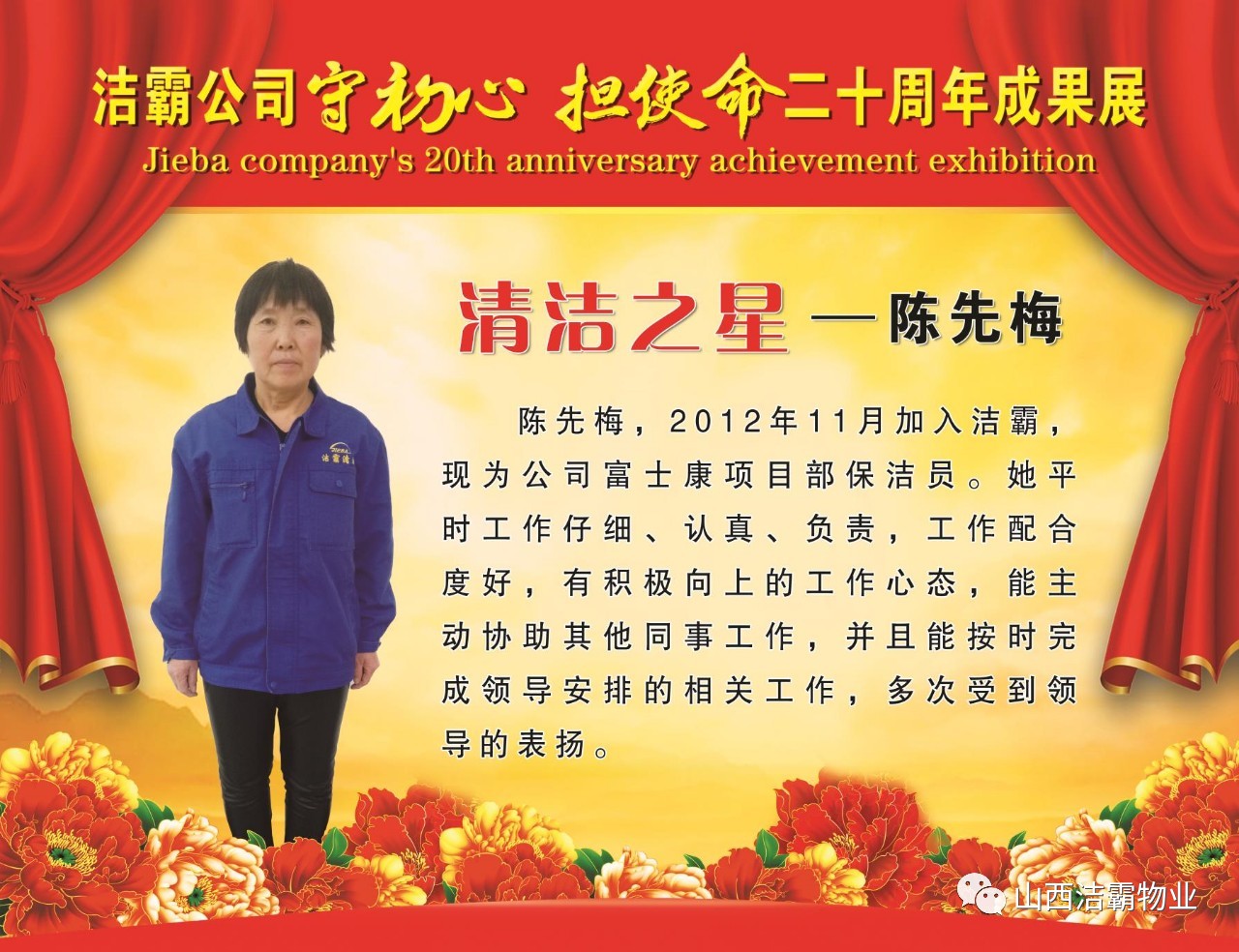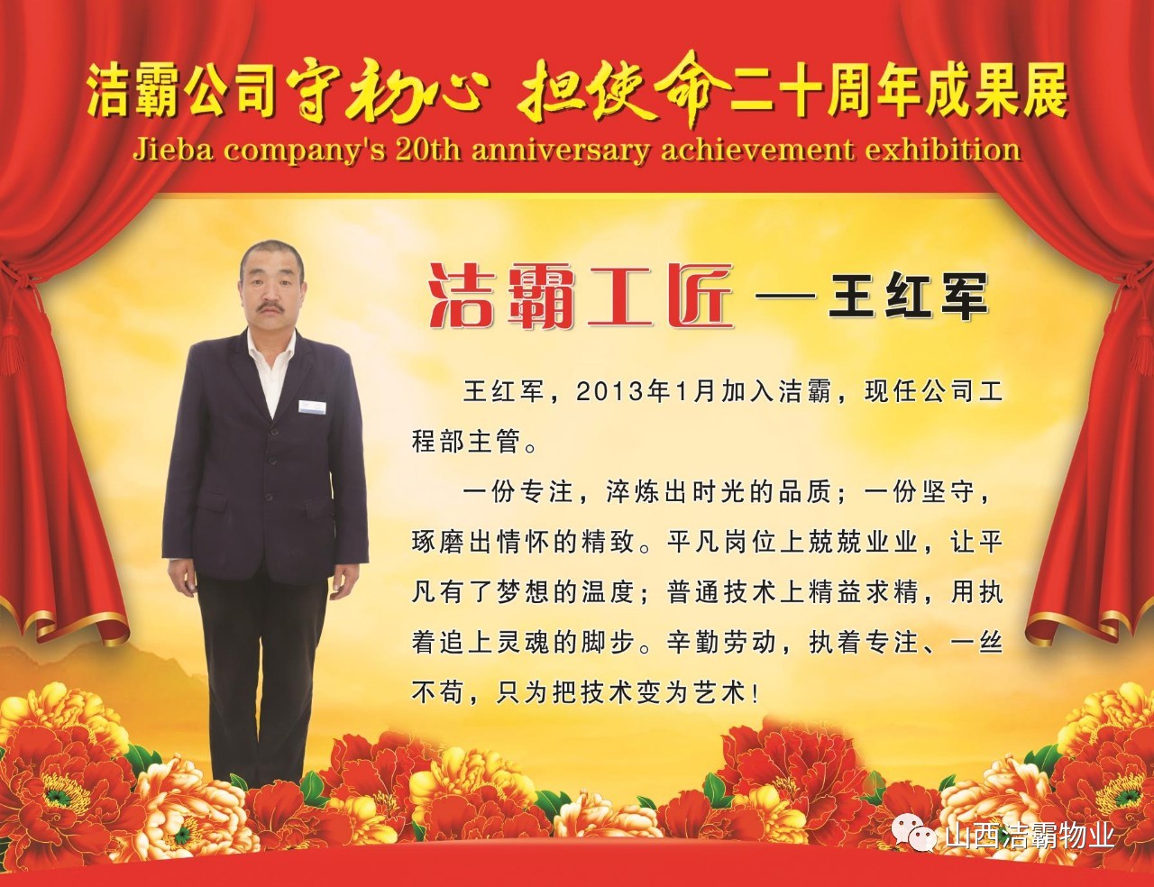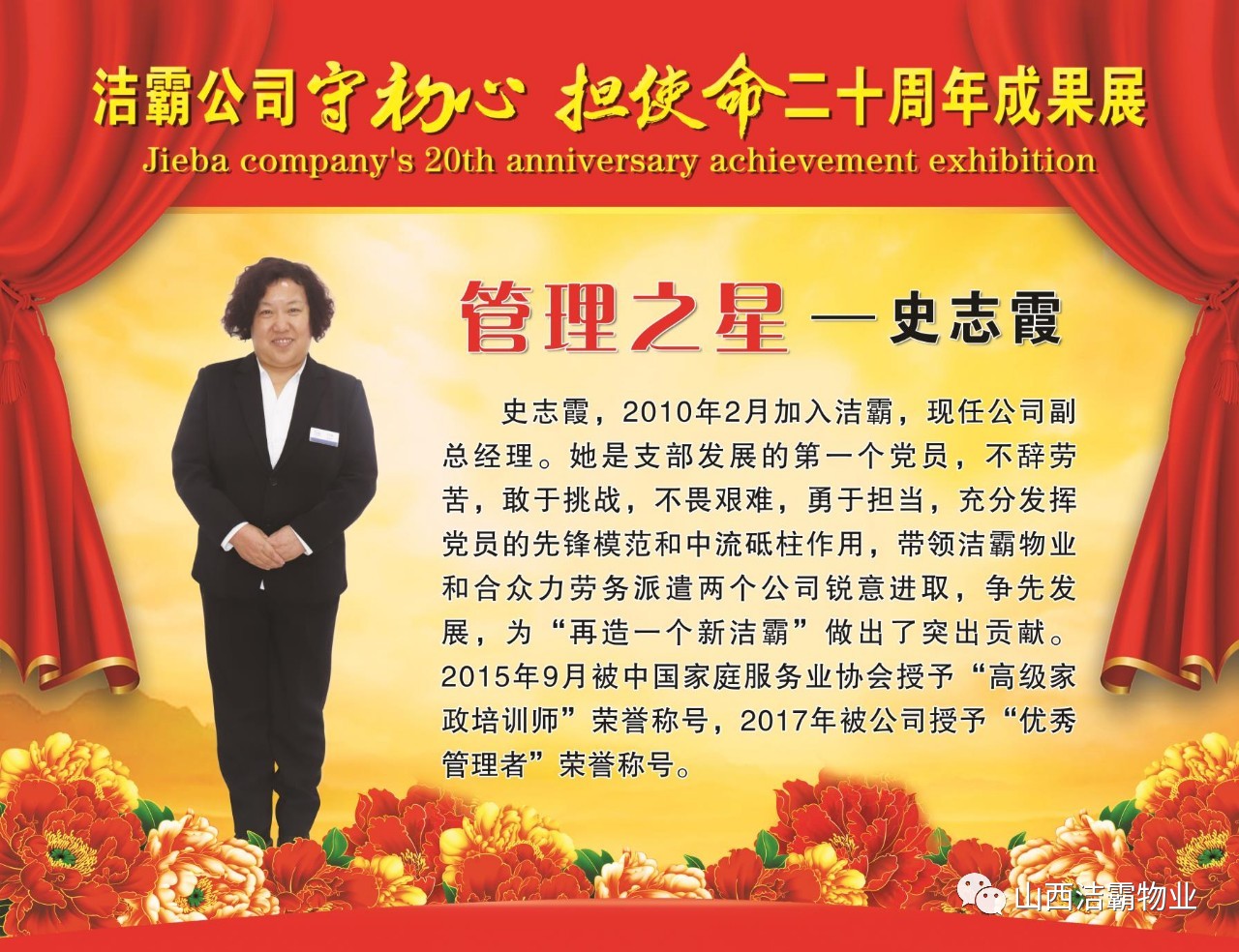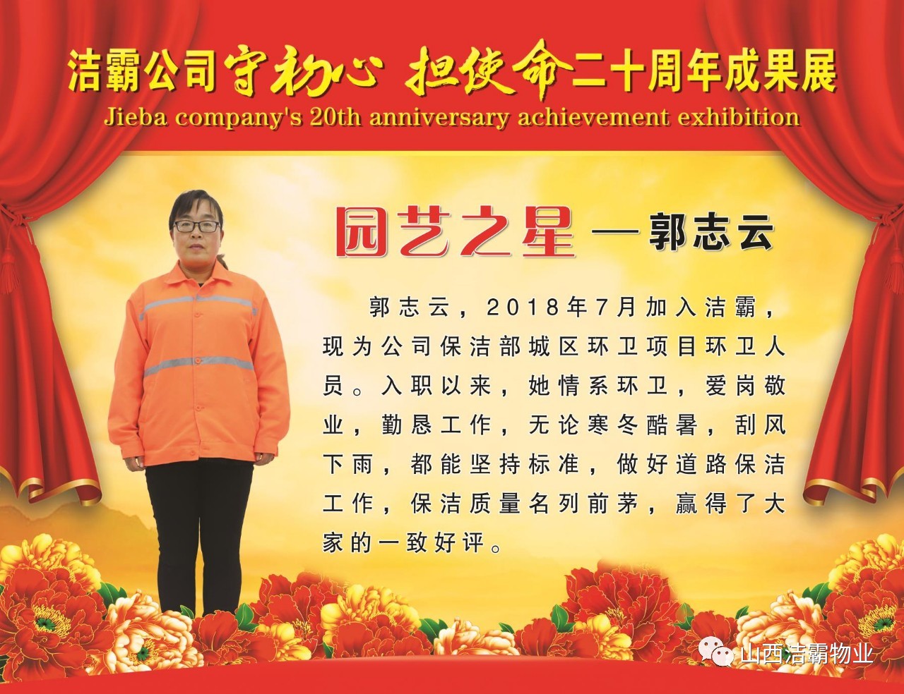本次晚會(huì)以“潔霸二十華彰,感恩共創(chuàng)輝煌”為主題,此次慶典的核心思想是“感恩”,主要角色是潔霸的創(chuàng)業(yè)者。為此,公司對(duì)入職潔霸的創(chuàng)業(yè)功勛和一線員工進(jìn)行了表彰獎(jiǎng)勵(lì)。本次晚會(huì)共設(shè)8個(gè)獎(jiǎng)項(xiàng),包括“潔霸先鋒”“奉獻(xiàn)之星”“管理之星”“潔霸管家”“潔霸工匠”“清潔之星”“潔霸衛(wèi)士”“園藝之星”等。他們是:李山虎、張永智、史志霞、陳福林、王紅軍、余艷青、劉二丑、成艷粉、楊改梅、王書(shū)玲、張國(guó)榮、耿竹青、張粉霞、宋秋苗、陳先梅、張晉平、張偉山、趙瑞軍、王廣平、郭志云。晉城市原副市長(zhǎng)成育廷、晉城市商務(wù)局原局長(zhǎng)王新善、晉城市非公和社會(huì)組織工委書(shū)記郎軍芳、晉城市婦聯(lián)三級(jí)調(diào)研員李蓮菊、晉城市總工會(huì)商貿(mào)輕紡煙草服務(wù)業(yè)工會(huì)主席張玉濤、晉城市城區(qū)財(cái)政局局長(zhǎng)翟明太等領(lǐng)導(dǎo)為他們頒獎(jiǎng)。