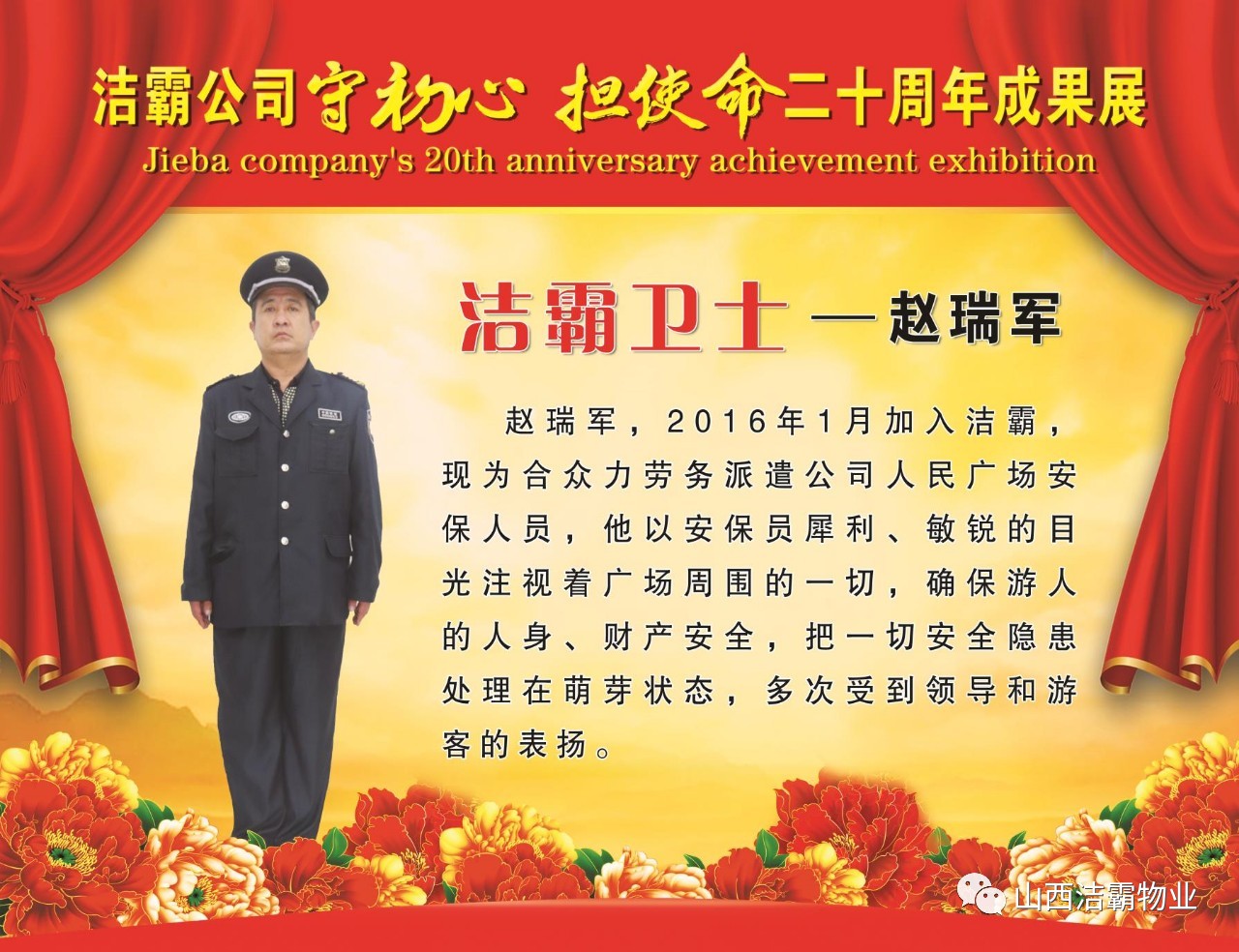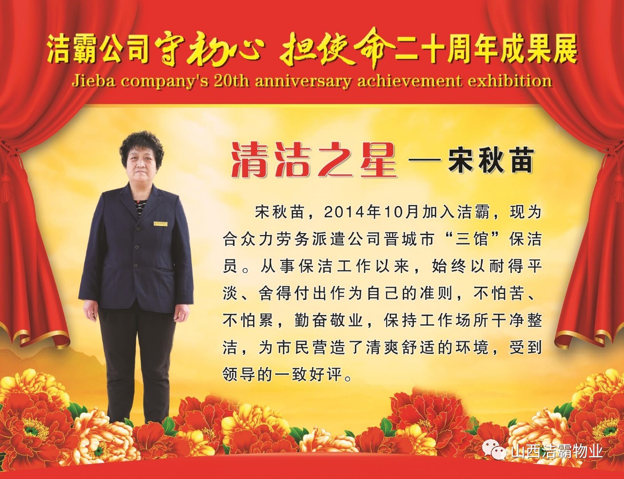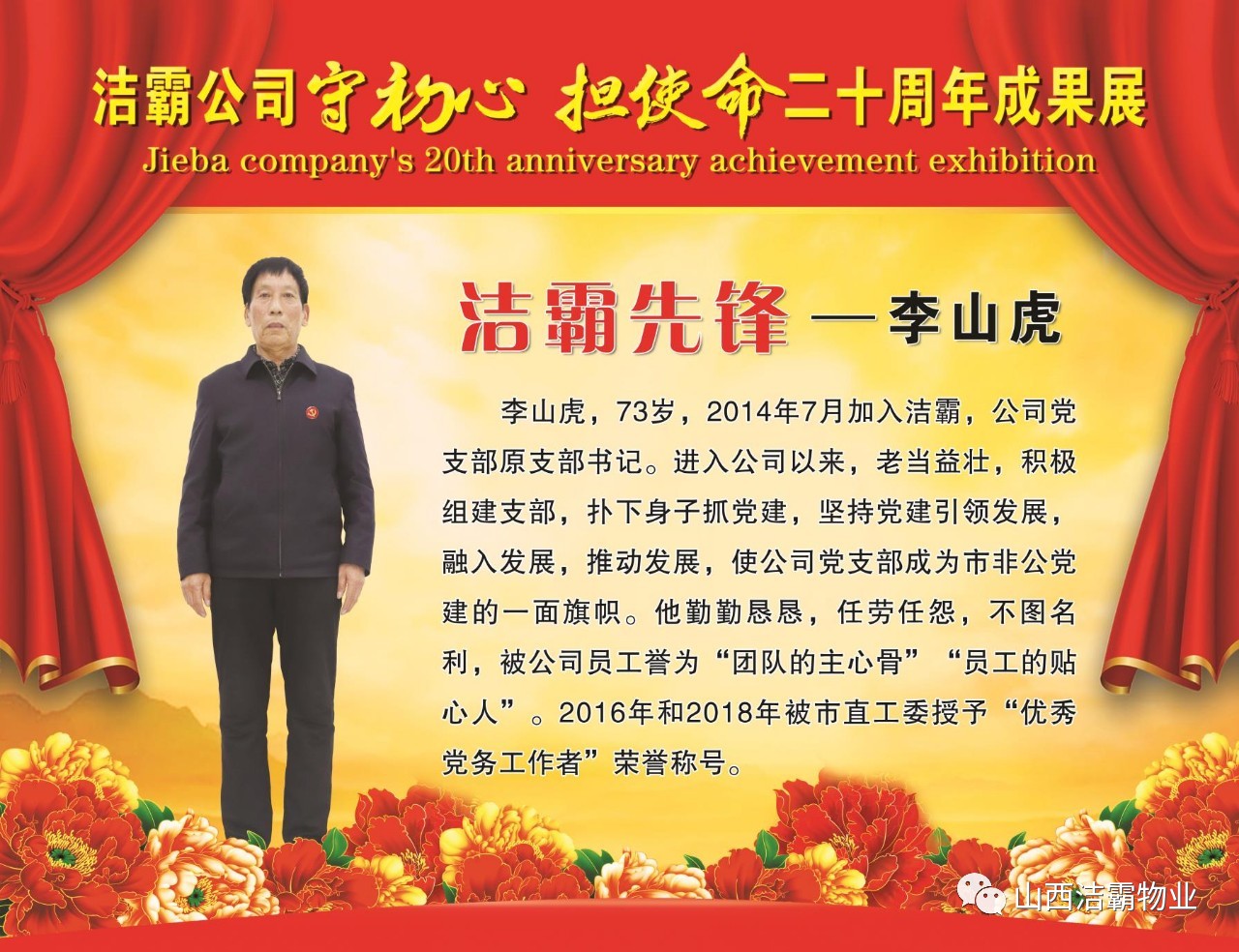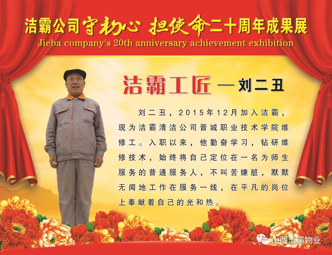 本次晚會(huì)以“潔霸二十華彰,感恩共創(chuàng)輝煌”為主題,此次慶典的核心思想是“感恩”,主要角色是潔霸的創(chuàng)業(yè)者。為此,公司對(duì)入職潔霸的創(chuàng)業(yè)功勛和一線員工進(jìn)行了表彰獎(jiǎng)勵(lì)。本次晚會(huì)共設(shè)8個(gè)獎(jiǎng)項(xiàng),包括“潔霸先鋒”“奉獻(xiàn)之星”“管理之星”“潔霸管家”“潔霸工匠”“清潔之星”“潔霸衛(wèi)士”“園藝之星”等。他們是:李山虎、張永智、史志霞、陳福林、王紅軍、余艷青、劉二丑、成艷粉、楊改梅、王書(shū)玲、張國(guó)榮、耿竹青、張粉霞、宋秋苗、陳先梅、張晉平、張偉山、趙瑞軍、王廣平、郭志云。晉城市原副市長(zhǎng)成育廷、晉城市商務(wù)局原局長(zhǎng)王新善、晉城市非公和社會(huì)組織工委書(shū)記郎軍芳、晉城市婦聯(lián)三級(jí)調(diào)研員李蓮菊、晉城市總工會(huì)商貿(mào)輕紡煙草服務(wù)業(yè)工會(huì)主席張玉濤、晉城市城區(qū)財(cái)政局局長(zhǎng)翟明太等領(lǐng)導(dǎo)為他們頒獎(jiǎng)。