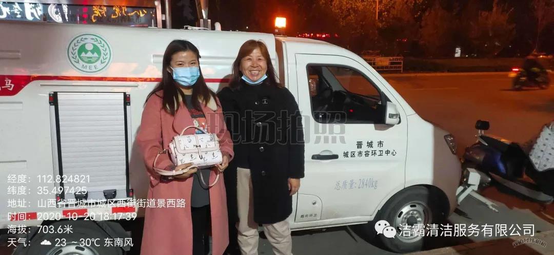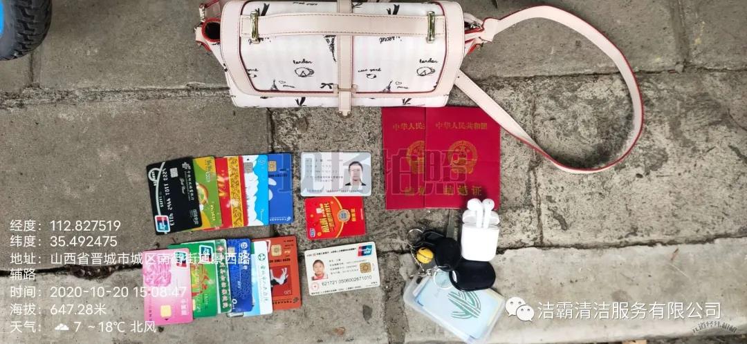10月20日下午3點(diǎn)左右,晉城市潔霸清潔服務(wù)股份有限公司保潔部環(huán)衛(wèi)經(jīng)理李通和工人在城區(qū)南街街道景西路段進(jìn)行街道清洗作業(yè)時(shí),忽然看見晉城農(nóng)商銀行門前的綠化帶里有一個(gè)女士挎包,忙叫環(huán)衛(wèi)工人郭志云把挎包撿了起來。當(dāng)時(shí)就考慮到失主丟失挎包以后一定很著急,在同事的共同見證下他們打開挎包,經(jīng)過查看,發(fā)現(xiàn)挎包內(nèi)有一張王女士的身份證、社保卡及銀行卡數(shù)張,還有結(jié)婚證、鑰匙、耳機(jī)、富士康工牌等物品。憑借富士康工牌上的工號(hào),他們給富士康打電話聯(lián)系到了失主,后由環(huán)衛(wèi)主管秦彩鳳將挎包交到失主手中。收到失而復(fù)得的挎包,王女士又驚又喜,感激萬分。