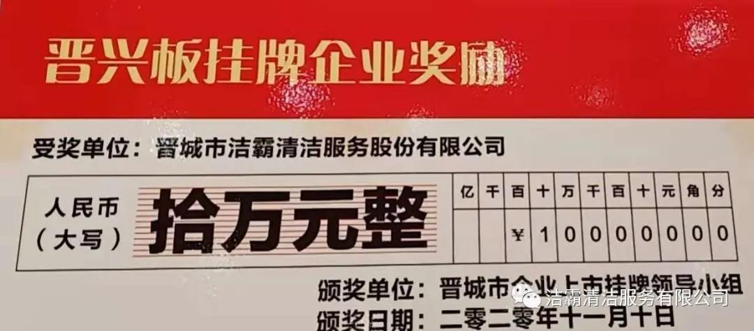 晉城市潔霸清潔服務(wù)股份有限公司于2019年11月27日成功登陸山西股權(quán)交易中心“專精特新板”(晉興板)(企業(yè)代碼:060200Z),是“專精特新板”開板暨首批掛牌的14家企業(yè)之一!皩>匦掳濉笔巧轿鞴蓹(quán)交易中心設(shè)立的特色板塊,為省內(nèi)具備專業(yè)化、精細(xì)化、特色化、新穎化的優(yōu)質(zhì)企業(yè)提供專屬服務(wù),成為帶動(dòng)全省中小企業(yè)創(chuàng)新創(chuàng)造、轉(zhuǎn)型升級(jí),壯大工業(yè)高質(zhì)量發(fā)展的生力軍。“晉興板”掛牌,標(biāo)志著公司正式進(jìn)軍資本市場,豐富了融資渠道,推動(dòng)公司高質(zhì)量轉(zhuǎn)型發(fā)展,成為公司發(fā)展的新引擎。