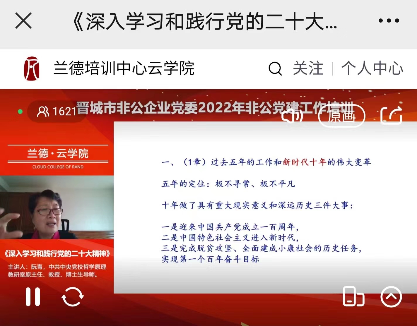 根據(jù)市非公企業(yè)黨委的安排,11月23日上午,公司黨支部組織全體黨員和入黨積極分子收看了市非公企業(yè)黨委2022年非公黨建工作培訓(xùn),聆聽(tīng)了中央黨校哲學(xué)原理教研室原主任、教授、博士生導(dǎo)師阮青主講的《深入學(xué)習(xí)和踐行黨的二十大精神》。
