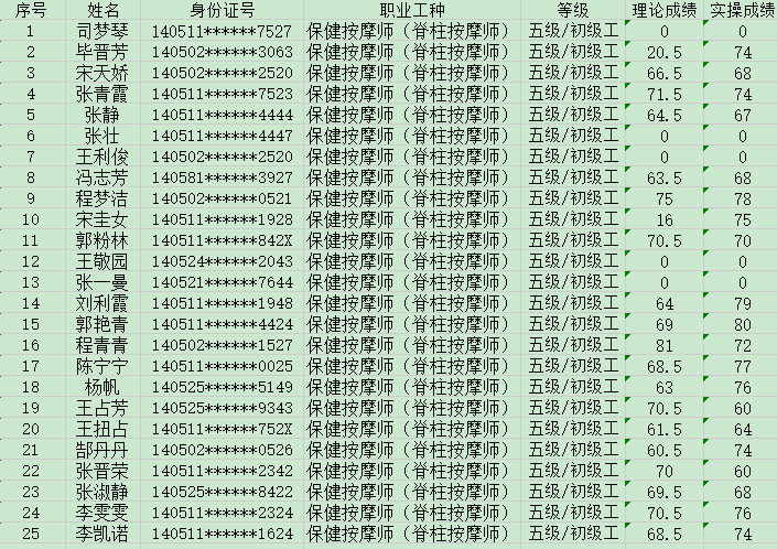 晉城市潔霸清潔服務(wù)股份有限公司職業(yè)技能等級(jí)認(rèn)定中心2024年5月24日第2批保健按摩師初級(jí)認(rèn)定人員成績(jī)公示