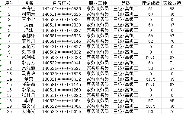 晉城市潔霸清潔服務股份有限公司職業(yè)技能等級認定中心2024年7月14日第6批家政服務員高級認定人員成績公示