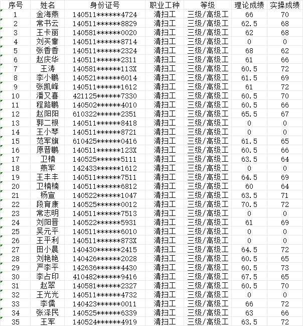 晉城市潔霸清潔服務(wù)股份有限公司職業(yè)技能等級認(rèn)定中心現(xiàn)將2024714日認(rèn)定人員成績公示如下: