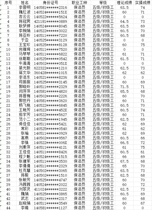 晉城市潔霸清潔服務(wù)股份有限公司職業(yè)技能等級認(rèn)定中心現(xiàn)將2024年7月21日認(rèn)定人員成績公示如下: