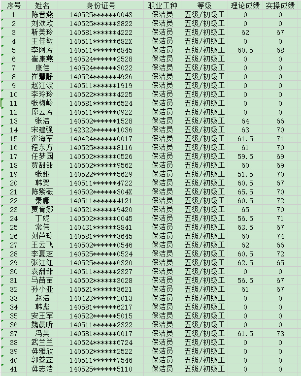 晉城市潔霸清潔服務(wù)股份有限公司職業(yè)技能等級認(rèn)定中心2024年8月4日第27批保潔員初級認(rèn)定人員成績公示
